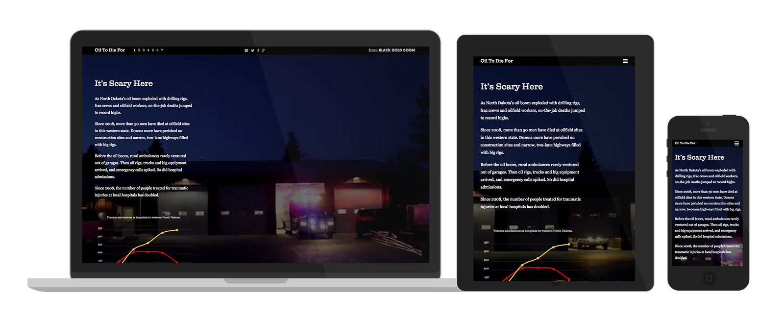 For Black Gold Boom's "Oil to Die For" interactive site, we wanted to design an experience that continuously delved into the costly dangers in of America's oil fields. Todd Melby - the journalist- approached the story through intimate narratives juxtaposed by industry wide data and interviews. Leaning on traditional chapter segments, we were able to guide audiences through repeated design elements while incorporating video backdrops, multimedia and an interactive timeline. The site is responsive in order to accommodate for the large percentage of mobile viewings from the last Black Gold Boom release.
